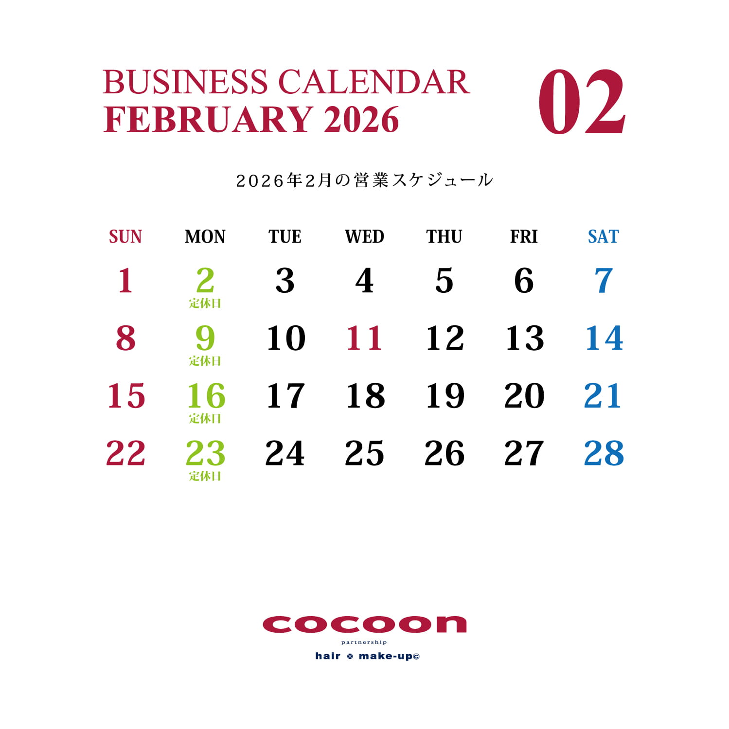 2026年2月の定休日は下記の通りになります。